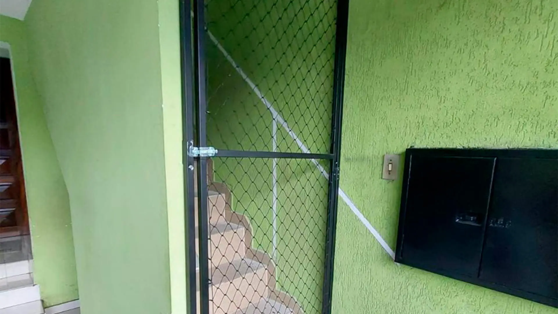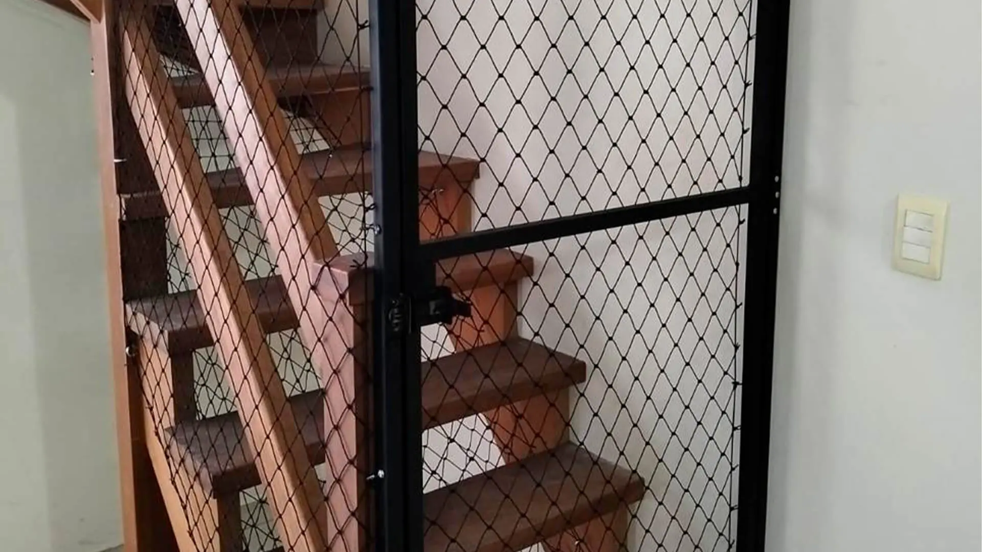 Portão e estrutura metálica com fechamento em rede de proteção, ideal para evitar fugas e quedas de gatos em varandas, quintais e áreas abertas.